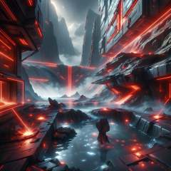 <lora:LaserTech:0.8> , scifi , lasertech , military grade,red lasers,  (outdoor hotspring) ,epic scenery, steamy