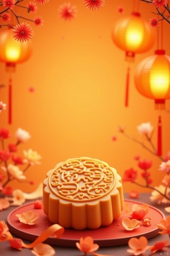 A vibrant Mid-Autumn Festival poster features a majestic mooncake with golden characters inscribed on its surface reading 'Tusi'. The crescent-shaped mooncake is placed against a warm orange backdrop, adorned with delicate lanterns and fluttering silk ribbons. Soft, golden light illuminates the composition, casting a gentle glow on the surrounding foliage.