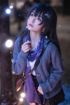 (masterpiece), (best quality), illustration, ultra detailed, hdr, Depth of field, (colorful),loli,[Artist:wlop],[[Artist:sheya]],Artist:hiten_(hitenkei),Artist:tokkyu, 1girl, scarf, solo, black hair, long hair, bag, looking up, hair ornament, snowflakes, long sleeves, snowing, hairclip, purple scarf, open clothes, parted lips, skirt, cardigan, outdoors, blurry, night, blush, upper body, sweater, purple eyes, breath, shoulder bag, pink eyes, shirt, earrings, blurry background, white shirt, hair between eyes