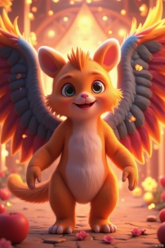 solo, looking at viewer, smile, open mouth, standing, full body, wings, no humans, fire, colorful