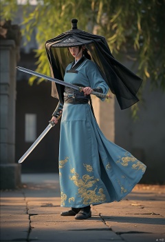 wuman,She is dressed in traditional East Asian attire, blending seamlessly with the surrounding natural environment. Her light blue robe flows like water, and a black sash embroidered with golden cloud patterns is tied around her waist, exuding an air of elegance and heroism. The fabric catches the mottled light that filters through the bamboo canopy as she moves.