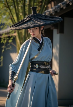 wuman,She is dressed in traditional East Asian attire, blending harmoniously with the surrounding natural environment. Her light blue robe flows like water, and a black sash embroidered with golden cloud patterns is wrapped around her waist, emanating an aura of elegance and valor. The fabric captures the dappled light that filters through the bamboo canopy as she moves.