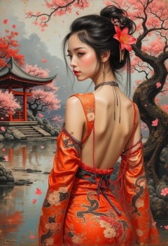 oil painting, rough, textural, broad brush strokes, of an oriental woman in a loose sleeveless, backless silk dress with oriental dragon designs, open down the sides to below the waist, nsfw, erotic, sexy, showing ample sideboob, flower in hair, sidelocks, sakura trees and petals, shinto temple