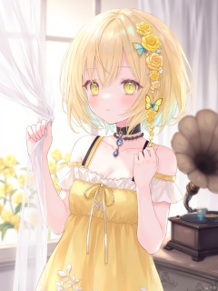 yunran,A girl with short golden hair and yellow eyes. There are yellow roses and butterfly-shaped hair clips in her hair. She is wearing a yellow dress. Around her neck is a gemstone necklace and a black choker. The straps of the dress are black. The girl's left hand is fiddling with the strap and her right hand is grasping a white transparent curtain. The lower part of the dress is decorated with pattern designs. The girl is standing in front of a window with yellow flowers. There is an old-fashioned vinyl record player on the right side of the girl.