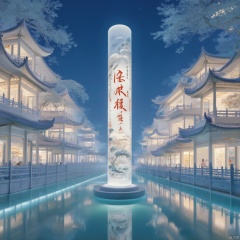 a tall white pillar stands in the middle of a pool of water. The pillar is adorned with Chinese characters in red and black