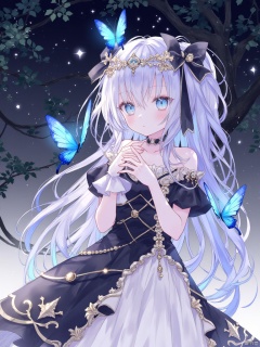 yunran,An animated girl with long white hair and blue eyes. She is wearing a black evening dress with a white skirt and flared sleeves. There is a black bow on her shoulder. The dress has exquisite golden decorations. Her hair is tied into a ponytail and she is wearing a crown on her head with bows pinned on both sides. There are blue butterflies on both sides of her. She has her hands crossed on her chest. There is a tree with green leaves behind her. The background is dark and there are white stars in the sky.