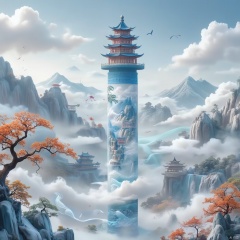 a vibrant blue and white Chinese tower stands in the middle of the frame. The tower is adorned with a detailed array of images