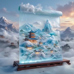 a glass sculpture stands atop a wooden platform. The sculpture depicts a Japanese temple