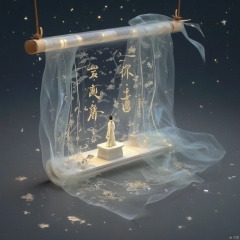 and a white curtain is draped across the top of it. There are white stars in the dark background