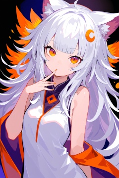 1girl, solo, orange eyes, looking at viewer, dress, white dress, grey hair, forehead mark, feather hair, bare shoulders, upper body, long hair, shawl, finger to mouth, parted lips, hagoromo, sleeveless, sleeveless dress, bangs, white hair, animal ears, hand up, long sleeves
