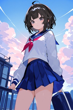1girl, bangs, black_hair, blue_sailor_collar, blue_skirt, long_sleeves, outdoors, pleated_skirt, sailor_collar, school_uniform, serafuku, shirt, short_hair, skirt, sky, solo, white_shirt