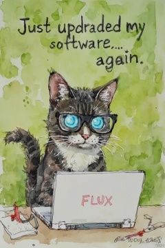 The image is a creative and whimsical graphic featuring a cat with human-like features, such as glasses and a contemplative expression. The cat is sitting at a desk and is positioned in front of a laptop labeled "FLUX" with the text "Just upgraded my software... again." above it. The cat's eyes appear to be glowing with a blue light, giving it a futuristic or magical look. The background is a warm, inviting green with a few items scattered around, including a notebook and a pair of scissors, which adds to the playful and humorous atmosphere of the image. The overall composition of the image is quite charming and amusing.