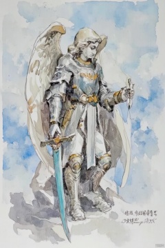 This image features a majestic angel in armor, standing against a backdrop of a blue sky. The angel has long, white hair, and her wings are spread wide, adding to her regal appearance. She is holding a sword with a blue blade, which stands out against the rest of the image. The armor she wears is detailed and intricate, with gold accents. The overall atmosphere of the image is serene and otherworldly.