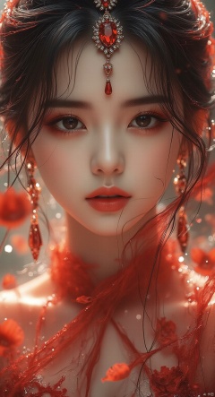 Close-up of beautiful woman's face, transparent red gauze covering her face, beautiful eyes, eye shadow, gorgeous accessories, falling petals, blurry foreground,