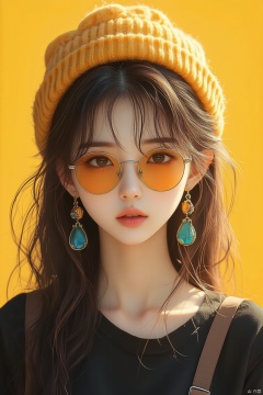 Realistic style, a beautiful woman,earrings,hat,jewelry,yellow background,beanie,looking at viewer,brown hair,tinted eyewear,medium hair,portrait,bangs,round eyewear,multicolored eyes,yellow headwear,orange-tinted eyewear,upper body,sunglasses,black shirt,blue eyes,,