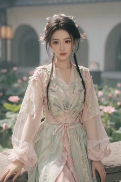 (((black hair))),(Sitting on the lotus pond porch:1.49) ,(A pond full of pink lotus flowers:1.5),close up of 1girl,Hairpins,hair ornament,hair wings,slim,narrow waist,perfect eyes,beautiful perfect face,pleasant smile,perfect female figure,detailed skin,charming,alluring,seductive,erotic,enchanting,delicate pattern,detailed complex and rich exquisite clothing detail,delicate intricate fabrics,