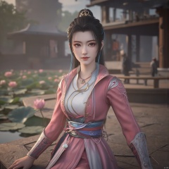 (((1gilr,black hair))),(Sitting on the lotus pond porch:1.39) ,(huge breasts:2.59),(A pond full of pink lotus flowers:1.3),close up of 1girl,Hairpins,hair ornament,hair wings,slim,narrow waist,(huge breasts:2.69),perfect eyes,beautiful perfect face,pleasant smile,perfect female figure,detailed skin,charming,alluring,seductive,erotic,enchanting,delicate pattern,detailed complex and rich exquisite clothing detail,delicate intricate fabrics,