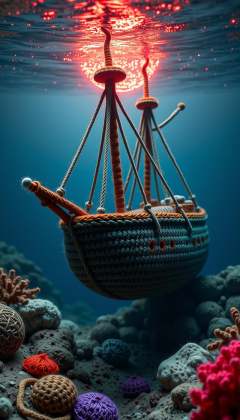 w00lyw0rld Digital art, Surrealism, Crimson veiled sunset, Dying star, Sunken ship, Crystal clear sea, Underwater, Realistic textures, Sharp details, High contrast, Dramatic lighting, Dusk atmosphere, Mystical, Sci-fi, Ocean, Corals, Seaweed, Starfish, Shells, Treasure chests, Rays of light, Wreckage, Moody, Vibrant colors, Glowing particles, Reflections, Transparent water, Shadows, Beautiful image, High quality, 5K resolution, 16:9 aspect ratio