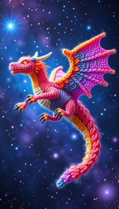 Made out of wool a Digital painting of a nebulous dragon soaring through the cosmos, Glowing, shimmering, iridescent, swirling colors, Nebula-like wings, Comet-like tail, Starry background, Space, Galaxies, Bright, colorful, Glowing eyes, Majestic, Powerful, Graceful, Peaceful, Tranquil, Serene, Awe-inspiring, Epic, Fantasy, Mythical, Magical, Dreamlike, Imaginative, Inspirational, Beautiful, Vibrant, Breathtaking, Majestic, Dramatic, Highly detailed, Crisp, Sharp, Realistic, Detailed, Intricate, Dynamic, Vivid, Stunning, Artstation, Concept art, Illustration, Wide angle, Wallpaper, Promo art, Splash art, Poster, Desktop wallpaper, Phone wallpaper, Artwork, High resolution, 8K, 4K, 2K, 1080p, 720p