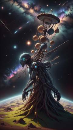 <lora:ElementEarth:0.9>ElementEarth Surreal digital art of a dreamcatcher delicately spun from glowing silver moonbeams, floating in a vast cosmic space, backdrop of swirling galaxies, nebulae, and shooting stars. Foreground elements include a galactic symphony orchestra of celestial beings playing various interstellar musical instruments, such as star harps, comet flutes, and planet drums. The overall mood is serene yet magical with a touch of whimsy. The color palette consists of deep blues, purples, and silvers with pops of vibrant neon colors from the various celestial light sources. The composition is balanced, with the dreamcatcher centrally positioned and the orchestra surrounding it in a semicircle. The orchestra members are a diverse array of ethereal beings, such as humanoid figures, mythical creatures, and alien entities. The rendering style is highly detailed, with a focus on smooth gradients, intricate textures, and realistic lighting., nature inspired, natural, earth, dirt, (Masterpiece:1.3) (best quality:1.2) (high quality:1.1)