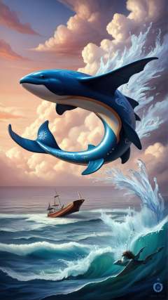 <lora:ElementWaterPDXL:0.5>score_9, score_8_up, score_7_up, score_6_up, ElementWater Realistic oil painting, large blue whale breaching ocean's surface, splashing water, vibrant sunset colors, orange, pink, and purple hues, calm sea, misty atmosphere, clear horizon, sailboat in the distance, dramatic clouds, soft light, serene mood, tranquil, peaceful, intricate details, textured, high-resolution, vivid, detailed, masterpiece, art print, wall art, (Masterpiece:1.3) (best quality:1.2) (high quality:1.1)