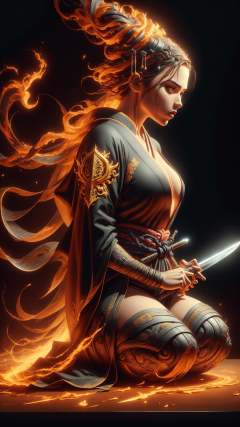 <lora:ElementFire:1>ElementFire Brown a beautiful sorceress wearing a black robe with gold embroidery, sitting at table, casting a spell, green glows, painted by stefan kostic and artgerm, in the style of magic the gathering, highly detailed digital art,Realistic digital painting of a gleaming samurai sword, Ancient Japanese calligraphy on the blade, Ornate hilt with gold and jewels, Set against a dark, moody background, Soft, dramatic spotlight on the sword, High contrast, Sharp focus, Intricate details, High resolution, Epic, Majestic, Powerful, Dramatic, (Masterpiece:1.3) (best quality:1.2) (high quality:1.1)