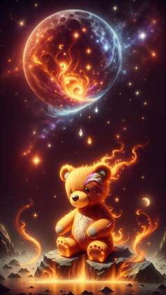 <lora:ElementFire:1.0>ElementFire Orange teddybear,Surreal digital art of a teardrop-shaped moon with a glowing, silver tear falling from it, creating a shimmering pool of mercury on a dark, rocky surface, Stars and galaxies in the background, Blue and purple hues, Neon lighting, Glowing particles, High contrast, Sharp focus, Smooth edges, Detailed reflections, Dreamlike atmosphere, (Masterpiece:1.3) (best quality:1.2) (high quality:1.1)