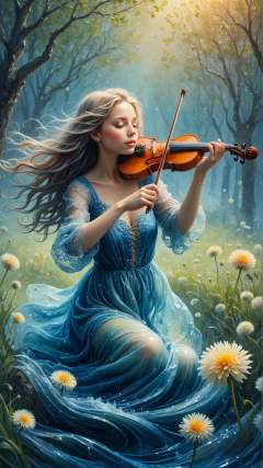 <lora:ElementWaterSDXL:1>ElementWater Fantasy oil painting of a small violin being played softly next to a large, peaceful, stone-like giant lying down with eyes closed, surrounded by a field of floating, whimsical dandelions in the wind, soft pastel color palette, sunset background, gentle smile on the giant's face, detailed texture on the violin and the giant's skin, impressionistic style, golden light, dreamy atmosphere, magical, concept art, artstation, wallpaper, illustration, surreal, enchanting, water, swirling, splash