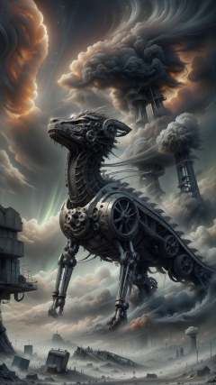 <lora:ElementWind:1.0> ElementWind Mouse,Surrealistic oil painting of a wandering soul, a lone figure shrouded in mist and shadows, traversing a barren landscape of ruins and debris, accompanied by a majestic, steampowered mechanical dragon, with intricate gears and steam vents visible, soaring alongside the wanderer, ominous stormy skies and glowing auroras in the distance, muted color palette of grey, silver, and soft blue, dramatic chiaroscuro lighting, melancholic atmosphere, highly detailed, rendered in a realistic yet dreamlike style, inspired by the works of Salvador Dali and Hieronymus Bosch, (Masterpiece:1.3) (best quality:1.2) (high quality:1.1)