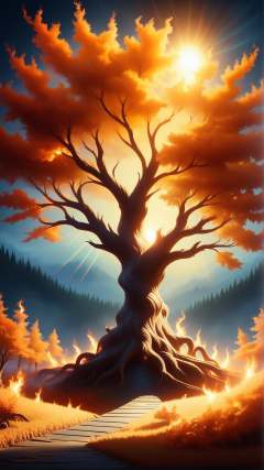 <lora:ElementFirePDXL:0.8>score_9, score_8_up, score_7_up, ElementFire Orange Golden apple tree, Eternal Autumn, Vibrant orange, red, and yellow leaves, Sunset, Warm colors, Realistic, Oil painting, Light mist, Forest, Tree trunk with intricate bark details, Rays of sunlight filtering through leaves, Soft shadows, Serene atmosphere, Lush grass below, Peaceful deer grazing nearby, fire, flames, blazing, (Masterpiece:1.3) (best quality:1.2) (high quality:1.1)