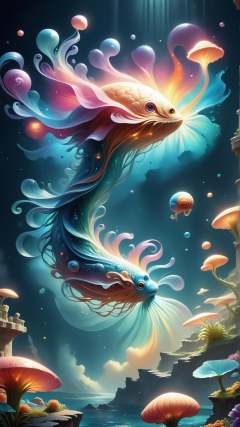 <lora:ElementWindPDXL:0.5>score_9, score_8_up, score_7_up, ElementWind An underwater sunken city, glowing with bioluminescent flora and fauna, ancient stone structures overgrown with iridescent algae and glowing mushrooms, deep sea anglerfish lighting the way, a sense of awe and mystery, twilight atmosphere, watercolor painting style, detailed, vibrant colors, atmosphere of a long-lost civilization, wind, blowing ethereal streaks, gusts