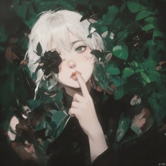 An Acrylic style painting that is expressive, gives it a dynamic and emotional quality. Anime art of a stylized portrait of a woman with a ethereal black and green mist surrounding her body. The mist creates a dramatic and surreal effect. A black flower, that is blooming, covering one eye, attached to the face. The woman has a cold aesthetic, complimented by her white hair. Anime art of woman draped in shadows with a lighting that enhances her unique features. The background is dark green, filled with black rose petals. Holding finger to lips, shush, shushing motion,