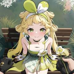 <lora:ww_in_one_a31-xl:1>,masterpiece,best quality,1girl,verina_(wuthering_waves),gloves,looking_at_viewer,flower,blush,fingerless_gloves,choker,pov,green_dress,solo_focus,holding,skin_fang,holding_flower,collarbone,closed_mouth,black_gloves,grass,smile,black_choker,hairband,fang,skirt,dress,white_gloves,bow,bare_shoulders,green_skirt,bench,outdoors,pov_hands,sitting,green_bow,sleeveless,