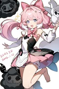 <lora:ww_in_one_a31-xl:1>,masterpiece,best quality,1girl,encore_(wuthering_waves),barefoot,solo,smile,bloomers,open_mouth,bow,looking_at_viewer,dress,hair_bow,sparkle,virtual_youtuber,sheep,thick_eyebrows,pink_bow,white_bloomers,detached_sleeves,holding,dated,white_background,