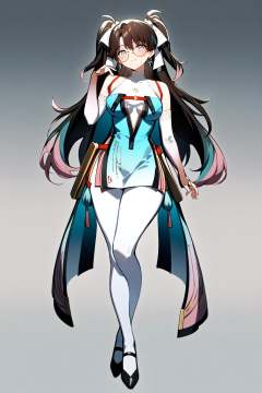 <lora:ww_in_one_a31-xl:1>,masterpiece,best quality,1girl,zhezhi_(wuthering_waves),solo,full_body,dress,glasses,white_pantyhose,jewelry,looking_at_viewer,round_eyewear,black_footwear,closed_mouth,grey_background,breasts,standing,pantyhose,bridal_gauntlets,smile,bare_shoulders,shoes,blue_dress,simple_background,sleeveless,hand_up,crossed_legs,white_thighhighs,elbow_gloves,gradient_background,gloves,medium_breasts,detached_sleeves,thighhighs,holding,