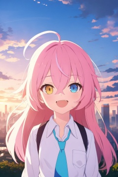 masterpiece,best quality,1girl,solo,necktie,shirt,sky,long hair,fang,cloud,pink hair,looking at viewer,white shirt,heterochromia,collared shirt,blue necktie,skyscraper,building,blue eyes,outdoors,hair between eyes,ahoge,upper body,sunset,yellow eyes,open mouth,no humans,smile,<lora:BA_v1_wd14_LoRA:0.8>,