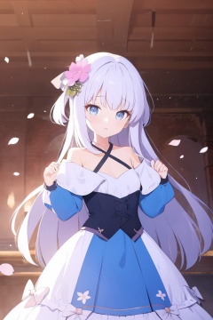 masterpiece,best quality,1girl,bow pose,head down,long hair,bangs,hair ornament,long sleeves,dress,ribbon,hair ribbon,flower,white hair,puffy sleeves,indoors,hair flower,off shoulder,sleeves past wrists,petals,blue dress,puffy long sleeves,off-shoulder dress,criss-cross halter,<lora:BA_v1_wd14_LoRA:0.8>,