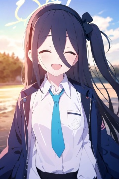 1girl, solo, aris (blue archive), necktie, closed eyes, long hair, blue necktie, halo, smile, black hair, shirt, collared shirt, hair between eyes, jacket, hairband, one side up, open mouth, white shirt, facing viewer, blush<lora:BA_v1_wd14_LoRA:0.8>,