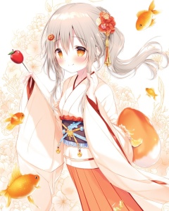 <lora:flux-shiratama-R2:1>,A high-quality image of a masterpiece featuring an artist named Torino Aqua, depicting a 1girl solo scene with a fish, specifically a goldfish, prominently displayed. The girl is wearing traditional Japanese clothes, including a kimono, adorned with a hair ornament, and a sash. She has a blush on her cheeks, a closed mouth, and long sleeves with wide sleeves. Her hair is styled with a flower and a hair flower, and she is holding a bag and a candy apple. The background is simple with a white background and a floral print. The girl's eyes are orange, and she has red nails and orange nail polish. Her hair is between her eyes, and she is looking directly at the viewer. This alternate costume features a ponytail and a cowboy shot perspective.