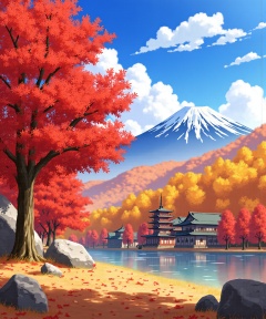 <lora:flux-shock-scenery:1>,The image is a digital illustration of a beautiful landscape with a mountain in the background. The sky is blue with white clouds and the mountains are covered in orange and yellow leaves, indicating that it is autumn. In the foreground, there is a large tree with red leaves, which stands out against the blue sky. The tree is in full bloom, with its branches reaching up towards the sky. On the right side of the image, there are several traditional Japanese buildings, including a pagoda and a temple, with a red roof and a tall tower. The buildings are surrounded by rocks and trees, and there are fallen leaves scattered on the ground, creating a peaceful and serene atmosphere. The overall color palette is warm and vibrant, with shades of orange, yellow, and red, giving the image a warm and autumnal feel.