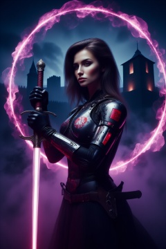 (A cinematic shot of a beautiful polish female dancer, detailed face features, black hair, robotic arms, robotic legs, holding a purple glowing katana by the handle in attacking pose, purple fire around the katana blade, best quality, amazing details, temple in background:1.2), polishswordsman