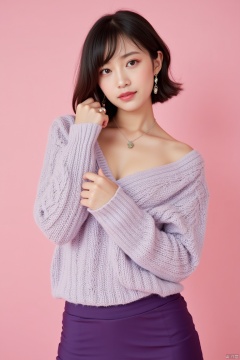 1girl, solo, looking at viewer, skirt, brown hair, shirt, black hair, long sleeves, holding, jewelry, earrings, medium hair, sweater, lips, purple skirt, realistic.yosshi film