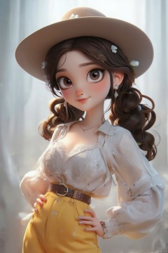 1girl, solo, long hair, breasts, looking at viewer, smile, shirt, brown hair, long sleeves, hat, cleavage, jewelry, twintails, brown eyes, ass, flower, cowboy shot, earrings, pants, belt, necklace, nail polish, hand on own hip, drill hair, white flower, high-waist pants, yellow pants