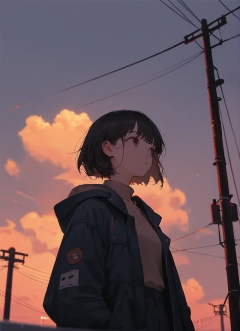 score_9,score_8_up,score_7_up,1girl, solo, outdoors, sky, power lines, utility pole, cloud, black hair, short hair, jacket, bangs, bag, blurry, sunset, upper body, blurry foreground, brown eyes, cloudy sky, looking afar, parted lips, closed mouth, evening, depth of field, looking away, sweater, long sleeves, coat