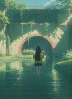 score_9,score_8_up,score_7_up,1girl, flower, solo, skirt, bag, backpack, long hair, yellow jacket, black hair, stairs, wading, water, outdoors, holding flower, plaid skirt, from behind, holding, plaid, plant, pleated skirt, standing, scenery, long sleeves, jacket, overgrown, facing away