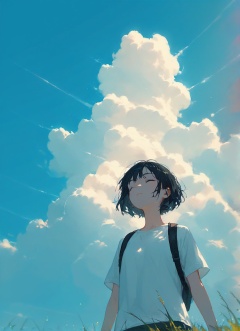 score_9,score_8_up,score_7_up,1girl,solo, sky, cloud, 1girl, backpack, outdoors, shirt, short hair, bag, from below, white shirt, day, blue sky, short sleeves, black hair, closed eyes, grass, standing, cloudy sky