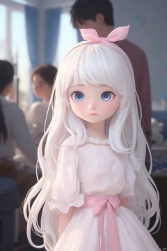 The image is an illustration of a young girl with long white hair and blue eyes. She is standing in front of a window with a blue curtain, and there are other people visible in the background. The girl is wearing a white dress with a pink ribbon tied around her waist and a pink bow on her head. She has a serious expression on her face and is looking off to the side. The overall mood of the image is peaceful and serene.
