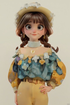 1girl, solo, long hair, breasts, looking at viewer, smile, shirt, brown hair, long sleeves, hat, cleavage, jewelry, twintails, brown eyes, ass, flower, cowboy shot, earrings, pants, belt, necklace, nail polish, hand on own hip, drill hair, white flower, high-waist pants, yellow pants