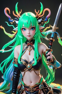 1girl, solo, long hair, weapon, sword, very long hair, green hair, blue eyes, full body, multicolored hair, makeup, bare shoulders, snake, looking at viewer, blunt bangs, antlers, lipstick, aqua hair, gradient hair, horns