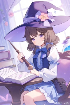 1girl, solo, witch hat, book, flower, hat, dress, purple eyes, holding, long sleeves, indoors, wand, pink flower, puffy long sleeves, blue dress, open book, purple flower, bow, hat flower, puffy sleeves, sitting, blush, flask, twitter username, holding wand, parted lips, brown hair, looking at viewer, witch